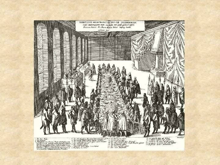 Középkor • A középkorban a vendéglátás a sok háború és a rossz közbiztonság miatt csak lassan éledt újjá. A főrangúak egymás váraiban, kastélyaiban szálltak meg és étkeztek. A kereskedők és zarándokok a kolostorok vendégszobáiban kaptak szállást és élelmet. • A vendéglátás fejlődésére nagy hatással voltak a középkor főúri házai és udvartartásai. Ebben a korban alakultak ki a főzés, az étkezés, a terítés és a felszolgálás legfőbb szabályai. • A hazai vendéglátásról István király uralkodása idejéből is maradtak fenn bizonyítékok. 1006 -ban már jövedelmező kocsmák működtek. • .