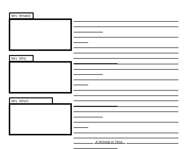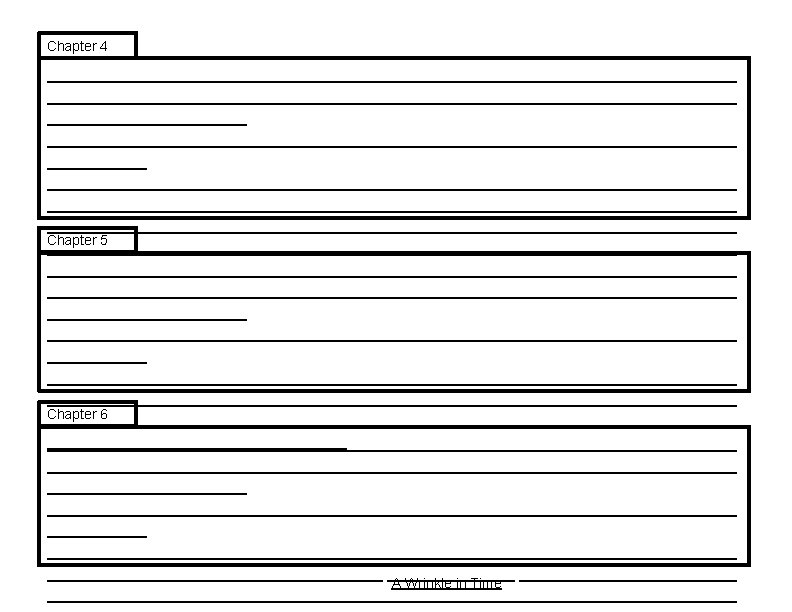 Directions: Write a description of each of the main characters from the story A Wrinkle in Time. Write a summary (5 -7 sentences) for each of the 12 chapters from A Wrinkle in Time. Meg Murry Charles Wallace Sandy and Dennys Murry ___________________________________________ ___________________________________________ ______________________________________________________________________________________ ___________________________________________ ________________________ A Wrinkle in Time ______________________