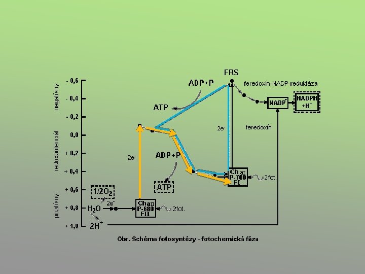 FOTOSYSTÉM I (PI resp. P 700) • absorpční maximum při 700 nm • přijme světelné kvantum (sníží se ox-red potenciál) uvolní se 2 e- (elektrony) zachyceny Fe. S-proteinem předány do systému redox. přenašečů putují až k Feredoxinu-Fd • od Fd jsou 2 možné cesty