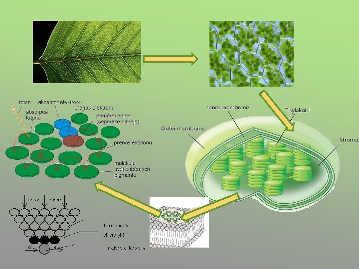 Fotosyntetický aparát • lokalizován v tylakoidech chloroplastů (u vyšších rostlin) (řasy- chromatofory, prokaryota- volně v cytoplazmě) • obsahuje fotosyntetická barviva – Chlorofyly (zelená barviva) – Karotenoidy (červená b. ) a xantofyly (žlutá´b. )