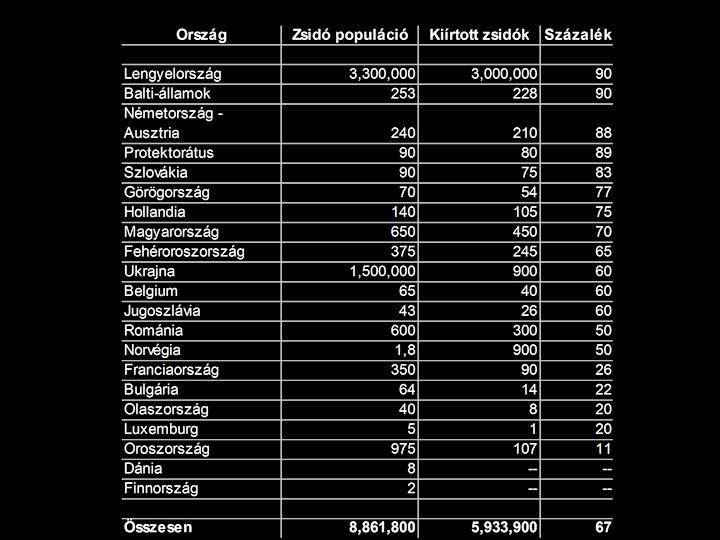 Endlösung • A zsidó nép teljes felszámolása • „Különleges bánásmód”, hivatalos okiratokban a folyamat körülírása • Halálgépezet, szervezett mészárszék • Koncentrációs- és haláltáborok, megsemmisítő központok