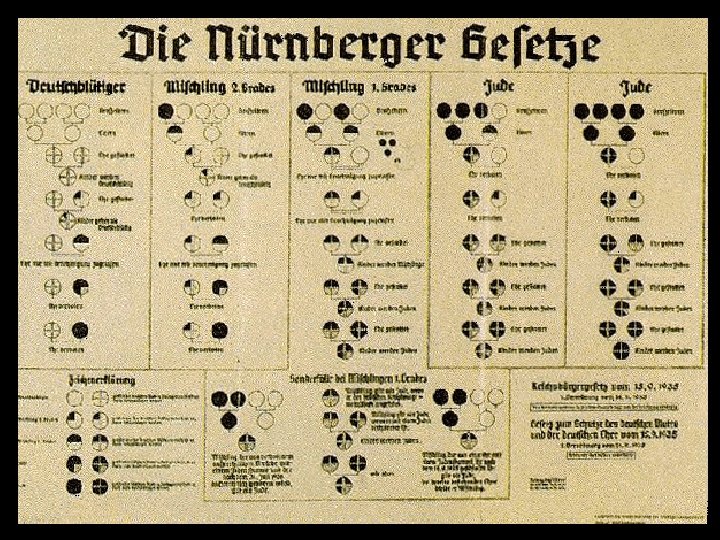 A zsidótörvények 1935, Nürnberg • Zsidók és nem zsidók közötti házasságkötés, kapcsolat tiltása • Zsidók nem vehetnek fel árja alkalmazottat • Árják csak 45. éven felüli nőt foglalkoztathatnak a háztartásokban • Állampolgárság megfosztása, másodrendű státusz