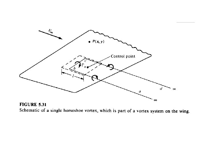 Vórtice em ferradura • • Vamos construir as componentes da velocidade normal induzida por um vórtice em ferradura integrando as contribuições dos três filamentos 1º - filamento ligado entre os pontos A e B