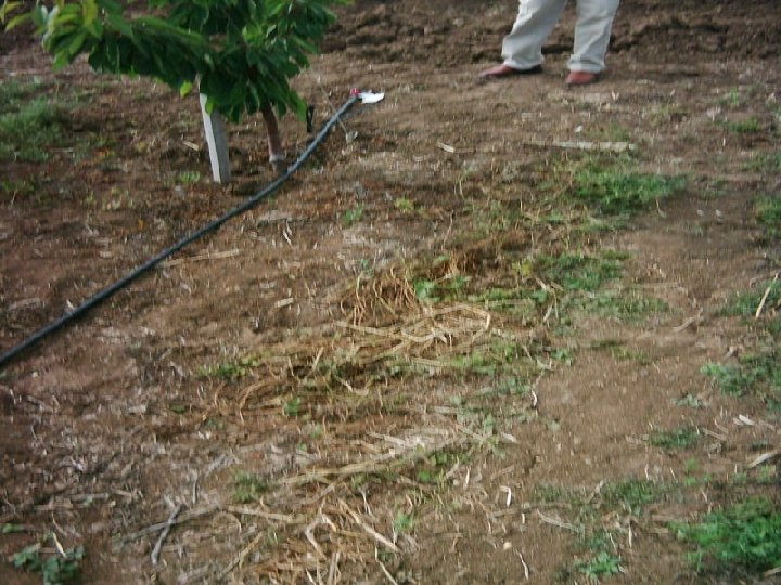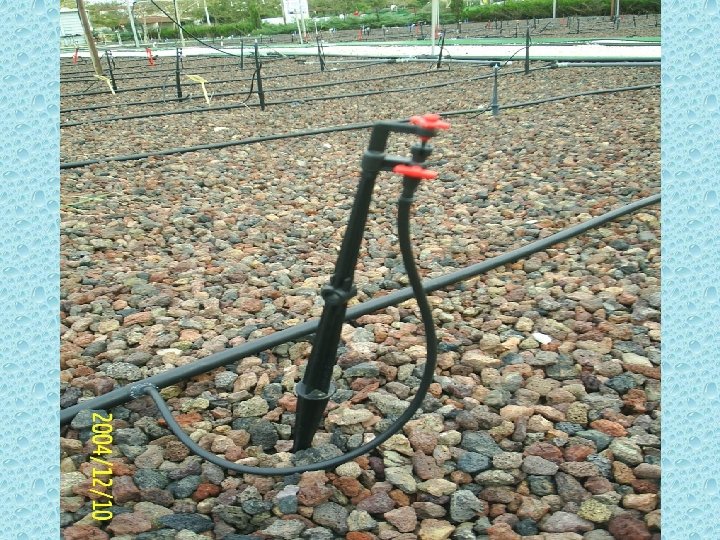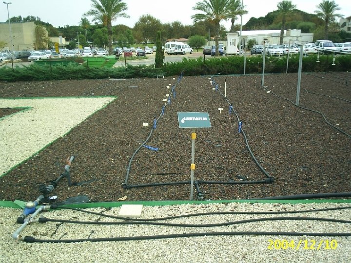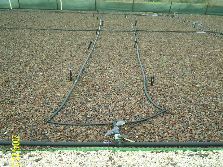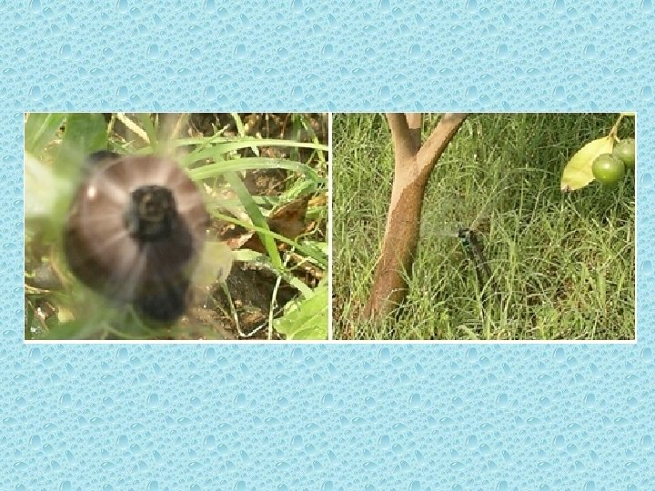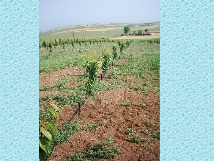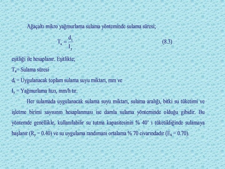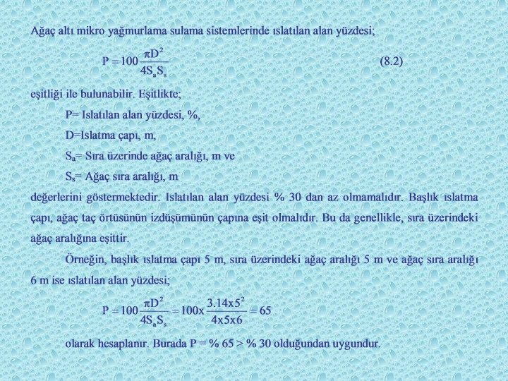 • Ağaçaltı mikro yağmurlama sulama yönteminde işletme basıncı 1 2 atm kadardır. Başlık debileri ise genellikle 30 300 L/h arasında değişmektedir. Bir yağmurlama başlığı, yaklaşık ağaç tacının izdüşümü kadar bir alanı ıslatır. Bu nedenle, gerek sıra üzerindeki ağaçlar arasında, gerekse ağaç sıraları arasında ıslatılmayan kuru bir alan kalabilir. Bu yöntemde, başlık aralığı sıra üzerindeki ağaç aralığına, lateral aralığı ise ağaç sıra aralığına eşittir (Şekil 8. 2).