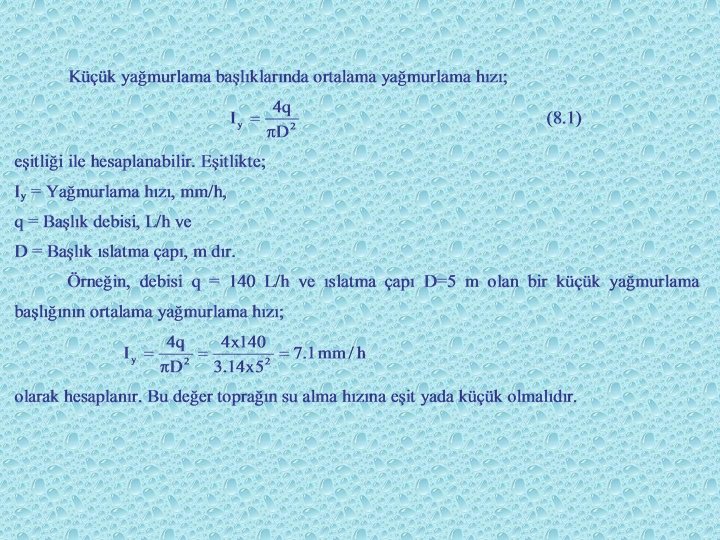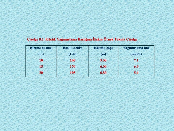 • Küçük yağmurlama başlıklarını üreten her kuruluş, başlık teknik özelliklerini belirten bir çizelgeyi planlayıcı yada uygulayıcıya vermekle yükümlüdür. Bu teknik çizelge de; optimum işletme basınçları, başlık debileri, ıslatma çapları ve yağmurlama hızı değerleri yer alır. Sistemin planlanması ve işletilmesi bu değerlere göre yapılır. Küçük yağmurlama başlıklarına ilişkin örnek bir teknik çizelge. Çizelge 8. 1 de verilmiştir.