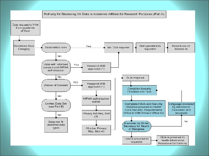 Privacy Take Away 1. VHA must still have the legal authority under – Privacy Act; – HIPAA Privacy Rule; – 38 USC 5701; and – 38 UUSC 7332, if applicable to make the disclosure of VA data to the Academic Affiliate. 2. VHA must still account for the disclosure.