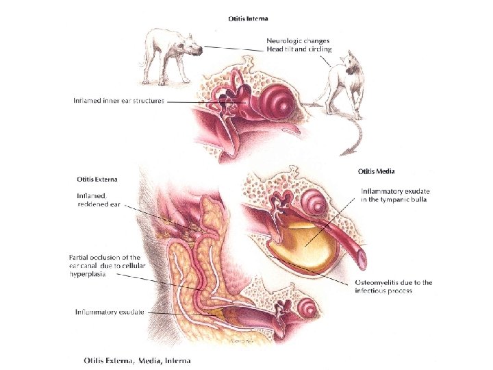 Oormijt • • Jonge dieren, besmettelijk Chronische otitis externa Veel korrelig cerumen Kleine, witte mijten rennen rond bij otoscopie