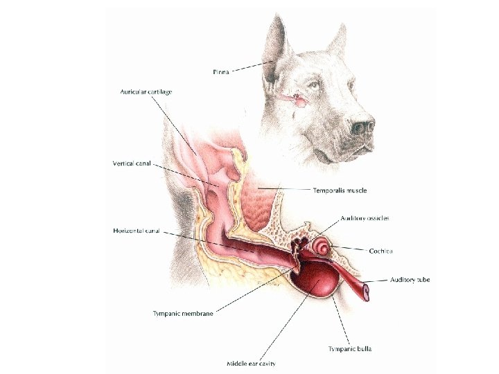 Overige afwijkingen aan het oor • • • Aangeboren erfelijke doofheid (witte vacht) Iatrogeen Otitis media Otitis interna Tumoren