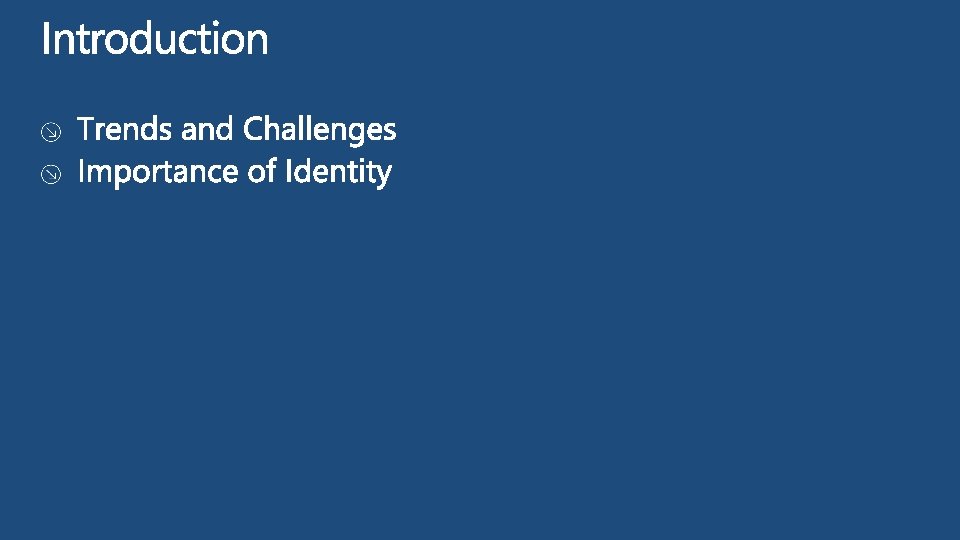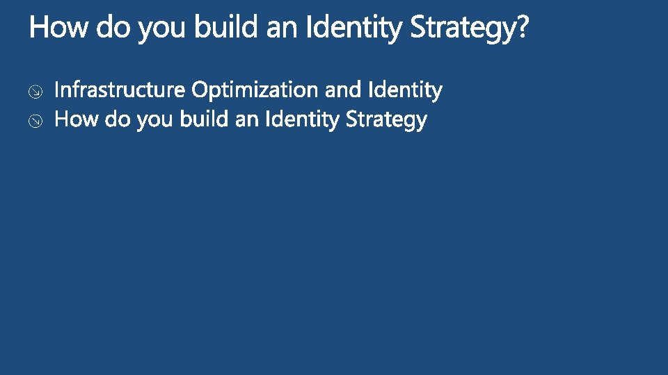 One Day Workshop Education 2 Week Assessment and Roadmap Assess Business Assess Infrastructure Identity Solutions Planning Define Roadmap Deployment Workshops are designed to introduce Identity and help customers understand how an identity solution could help their enterprise. Customer Benefits Include: • Introduction to core tenants of Identity • Discussion around recommended practices • Detailed explanation of Microsoft identity solutions • Business Value modeling Traditional IT TECHNOLOGIES Private Public Hybrid DESIRED END STATES Partners