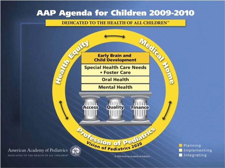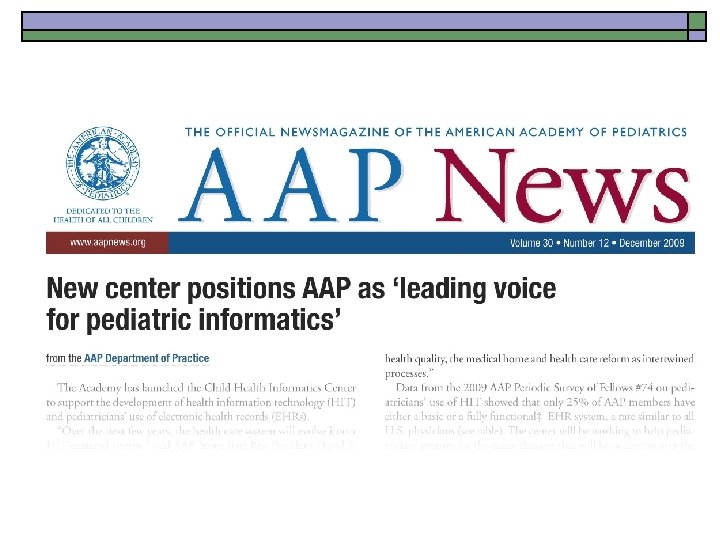 Child Health Informatics Center o o Authorized by AAP Board in October 2009 Advisory Committee, Investigators - in formation n o Steve Downs, MD, FAAP Indianapolis, IN Bill Adams, MD, MPH, FAAP Boston Medical Center Chris Lehmann, MD, FAAP Johns Hopkins University Will serve as “home” for health information technology initiatives within the AAP