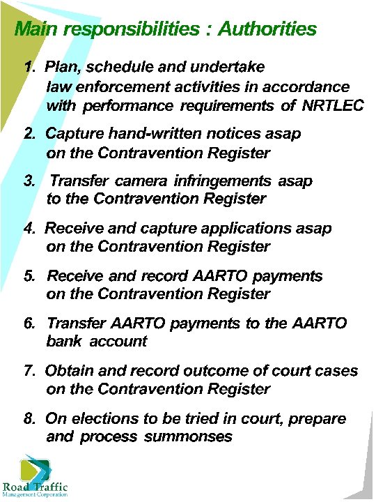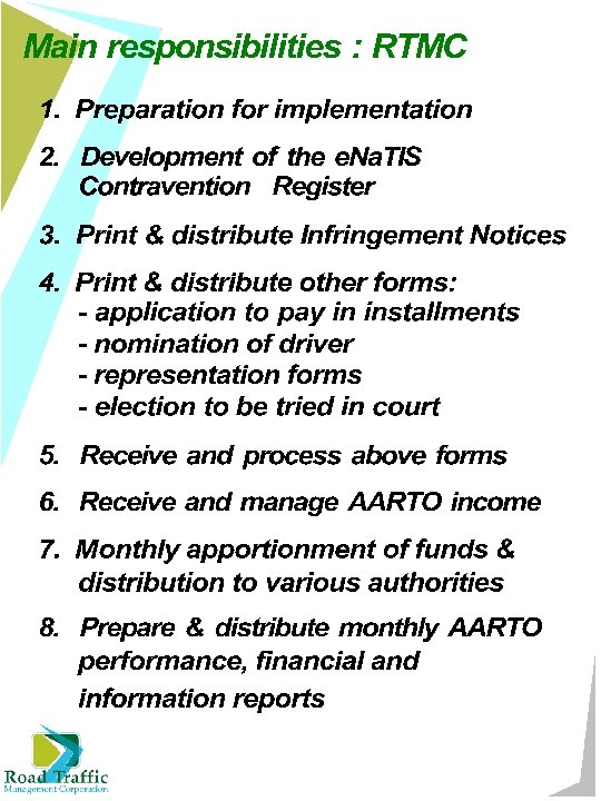 Outstanding Issues • Appointment of Representation officers • Appointment of Sheriffs • SLA between RTIA & RTMC • RTIA strategic & business plans • SLA between RTMC & Issuing Authorities • SLA between RTMC & Post Office