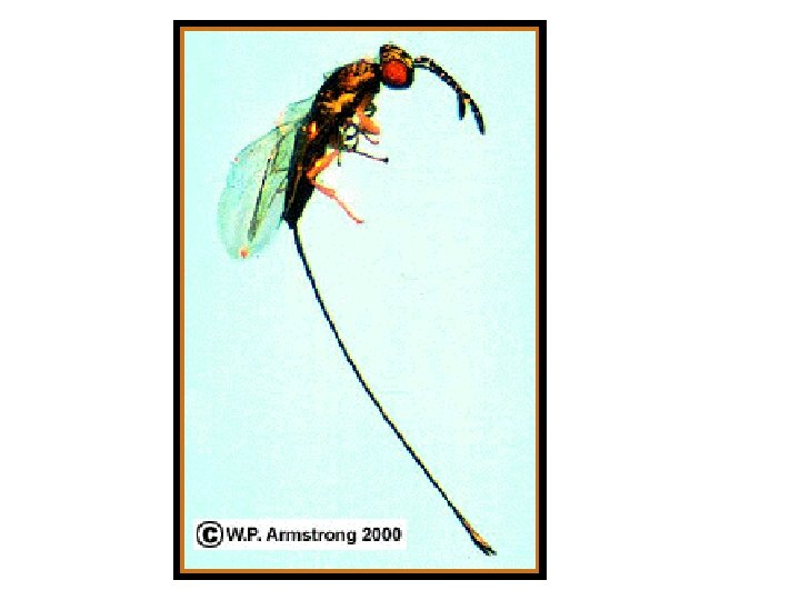 • Ovipositor is lacking in fruit flies and house flies. • In fruit flies, the elongated abdomen terminates into a sharp point with which the fly pierces the rind of the fruit before depositing the eggs.