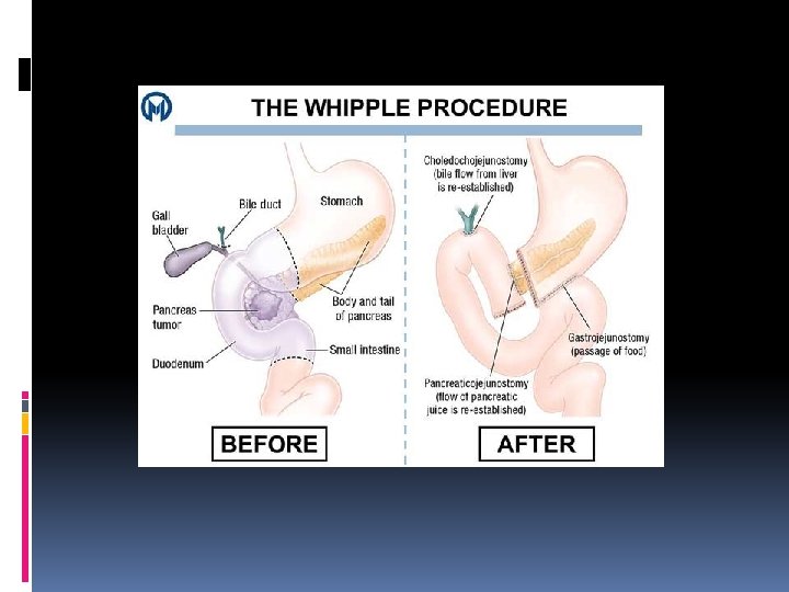 Surgical Procedures Whipple procedure: Removal of the head of the pancreas, duodenum, parts of the jejunum and stomach, gallbladder, and possibly the spleen The pancreatic duct is connected to the common bile duct and the stomach is connected to the jejunum Post-op care 108