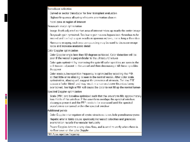 Grayscale Evaluation of the Transplanted Liver A complete grayscale examination of the liver should be performed, including long-axis and transverse views. The liver parenchyma should be assessed for focal and/or diffuse abnormalities, and the echogenicity and echo texture of the liver should be noted. The biliary tree should be evaluated and the caliber of the common duct measured when possible. The subphrenic and subhepatic spaces should be investigated for possible fluid collections. Grayscale images of the hepatic vessels, including the portal vein, hepatic veins, and inferior vena cava (IVC), should be obtained.