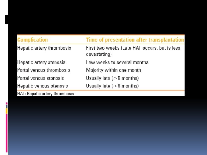 Hepatic Venous and Inferior Vena Cava Complications Thrombosis and stenosis are two rare complications of the IVC and hepatic veins, after hepatic transplantation. The venous complications tend to occur at the anastomosis and knowledge of the surgical anatomy is useful. The incidence of hepatic venous outflow stenosis is higher in living donors and split graft liver pediatric grafts than in whole liver grafts, likely due to the size mismatch and small anastomosis. Most hepatic venous stenosis present late, many months to years after transplantation.