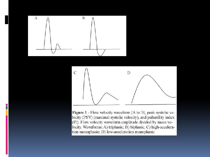 Figure 1: previous slide Normal main hepatic arterial waveform. Doppler image of the main hepatic artery post liver transplant shows continuous antegrade flow with rapid systolic upstroke, RI of 0. 60 and PSV of 110 cm/s