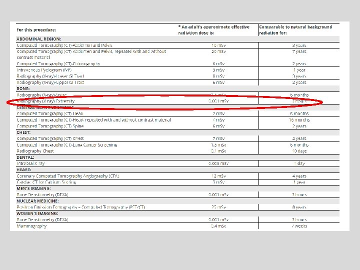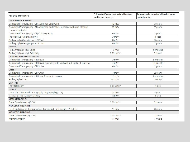 Computed Tomography — An Increasing Source of Radiation Exposure Brenner DJ and Hall EJ NEJM Volume 357: 2277 -2284 November 29, 2007 Number 22 A 10 m. Sv CT in a 25 year old is associated with an estimated : – Risk of induced cancer 1 in 900 – Risk of induced fatal cancer 1 in 1800