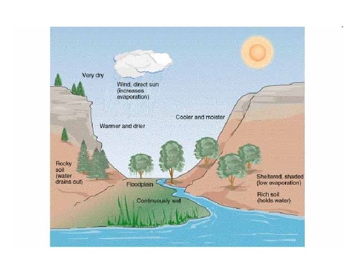 Microclimates • Macroclimate: • Microclimate: • Altitude • Higher altitude - lower temperature. – Aspect • Offers contrasting environments. – Vegetation • Ecologically important microclimates.