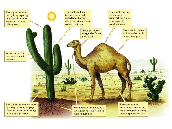Dissimilar Organisms with Similar Approaches to Desert Life • Camels – Can withstand water loss up to 20%. • Face into sun to reduce exposure. • Thick hair: Increased body temperature lowers heat gradient. • Saguaro Cactus – Trunk / arms act as water storage organs. – Dense network of shallow roots. – Reduces evaporative loss.