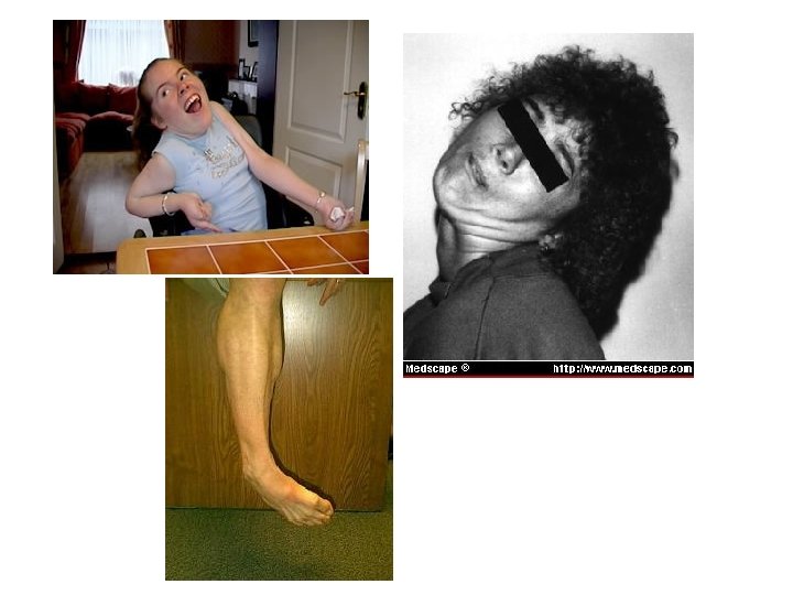 Dystonia (co-contraction; abn. posture) • Def: involuntary sustained or intermittent muscle contractions causing twisting or repetitive movements, abnormal postures or both. Can affect any part of the body incl. arms, legs, trunk, neck, eyelids, face, vocal cords. Can be painful • Disappears with sleep • Caused by an imbalance of neurotransmitters