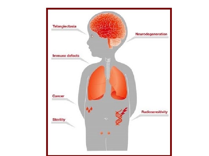 Ataxia-Telangiectasia • • Slowly progressive cerebellar ataxia Telangiectasis of skin and congunctivae Frequent sinobronchopulmonary infections Chorea-athetosis Malignancies – lymphoreticular Sensitivity to ionizing radiation Ocularmotor apraxia