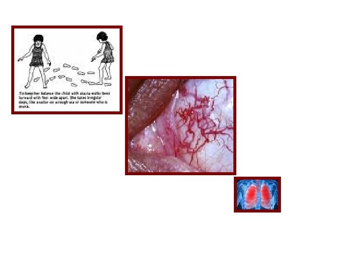 Ataxia telangiectasia • • Progressive ataxia(1 -4 years) Abnormal eye movements - oculomotor apraxia Telangiectasia(3 years-adolescence) Cutaneous manifestations High risk for malignancies Abnormality in cellular and humoral immunity Elevated alpha feto protein