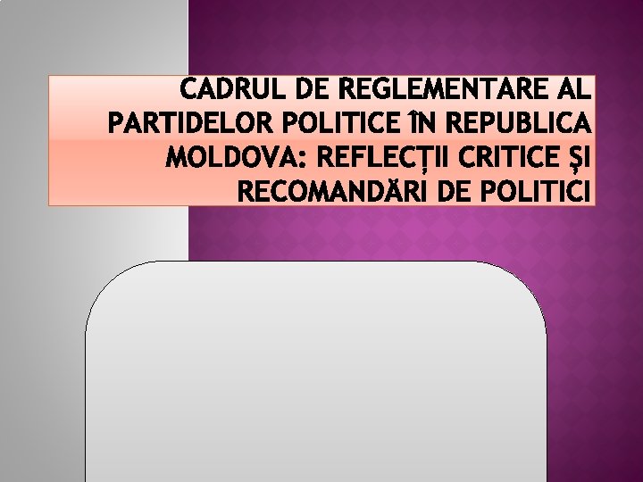 Prevederi explicite în: I. Legea cu privire la partidele politice (2007) !Legea privind partidele politice (1999) Art. 9 (6): Partidele şi alte organizaţii social-politice vor promova principiul egalităţii femeilor şi bărbaţilor în organele decizionale de toate nivelurile � Ce stipulează pe moment? Articolul 18. Obligaţiile şi răspunderea partidelor politice (1) Partidele politice sînt obligate să respecte legislaţia Republicii Moldova şi prevederile statutelor lor. (2) În cazul modificării legislaţiei, precum şi în cazul constatării necorespunderii statutelor şi programelor cu prevederile legale, partidele îşi vor aduce documentele în corespundere cu normele legale, modificîndu-le şi completîndu-le conform procedurii stabilite. • Acţiune afirmativă – finanţare stimulatorie II. Codul Electoral a. sistem electoral bazat pe proporţionalitate (cota ca acţiunea afirmativă) b. dacă Statutul PP prevede cota de reprezentare, să se respecte şi pe listele electorale