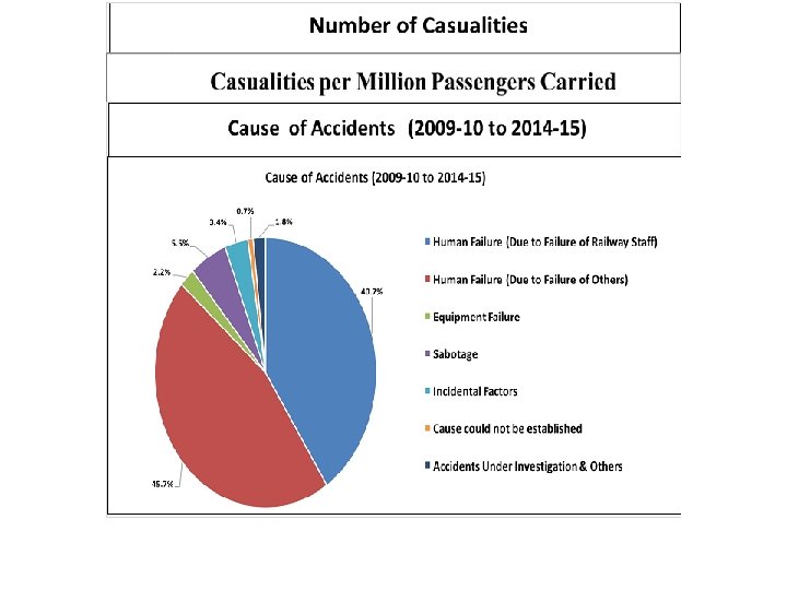 Reasons and responsibility of accidents Sno. Reasons 2006 -07 to 2010 -11 (in %) 2009 -10 to 2014 -15 (in %) 1 Human failure (failure of Rly staff) 42 40. 7 2 Human failure (failure by other than rly) 43 45. 7 3 Failure of equipment/ equipment's 3 2. 2 4 Sabotage 7 5. 5 5 Combination of factors 1 0 6 Incidental 3 3. 4 7 Could not be established 1 0. 7 8 Under investigation 0 1. 8