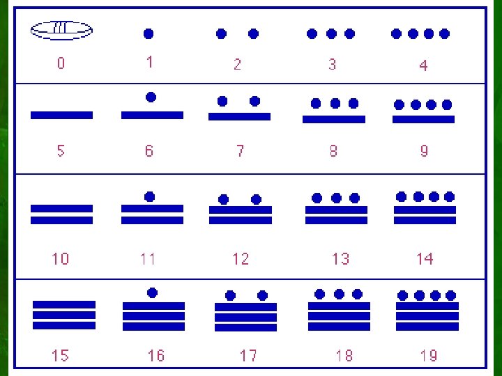 • Away from the Babylonian system, the Mayans are thought to be the first civilization to use the number zero as a placeholder. The Mayans devised a counting system that was able to represent very large numbers by using only 3 symbols, a dot, a bar, and a symbol for zero, or completion, usually a shell. The chart above shows the first complete cycle of numbers. Like our numbering system, they used place values to expand this system to allow the expression of very large values. Their system has two significant differences from the system we use: 1) the place values are arranged vertically, and 2) they use a base 20, or vigesimal, system. See the next slide. . .
