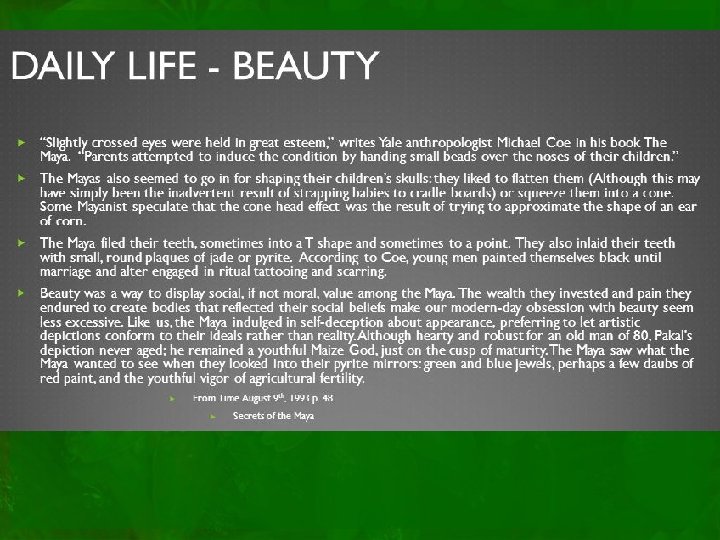 Beauty is culturally relative • If you thought the modern-day world was riddled with vanity, then wait until you read this. Believe it or not, The pre. Columbian Mayans enhanced their children's features by regularly pressing boards against their children's forehead to preserve any early onsets of wrinkling! But, as was often the case, such pressing resulted in the forehead receding.