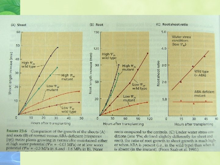 ABA promotes root growth and inhibits shoot growth at low water potentials ABA has different effects on the growth of roots and shoots, and the effects are strongly dependent on the water status on the plant