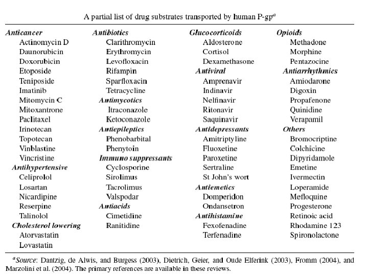 2. Active Transport--a) chemicals are moved against an electrochemical gradient; b) the transport system is saturable; c) requires the expenditure of energy. Examples: 1. multi-drug-resistant protein (mdr)—decreases GI absorption, blood-brain barrier, biliary excretion, placental barrier 2. Multi-resistant drug protein (mrp)—urinary excretion, biliary excretion 3. Organic-anion transporting polypeptide (oatp)—hepatic uptake of organic anions 4. Organic anion transporter (oat)—kidney uptake of organic anions 5. Organic cation transporter (oct)—kidney, liver and placental uptake of organic cations 6. Divalent-metal ion transporter (dmt)—GI absorption of divalent metals (Fe 2+, Cu 2+, Mg 2+, etc. ) 7. Peptide transporter (pept)—GI absorption of peptides