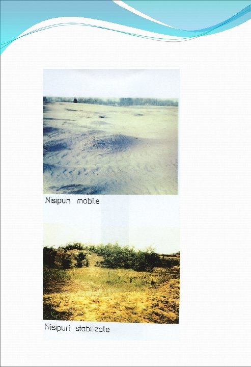 MASURI DE COMBATERE A DEFLATIEI EOLIENE ØAmplasarea perdelelor agroforestiere perpendicular pe direcţia vântului dominant, este considerată ca o primă măsură cu caracter permanent şi de lungă durată pentru prevenirea şi combaterea acestui proces natural de degradare a solurilor nisipoase şi de protejare a culturilor agricole. Spaţiul protejat de vânt în spatele perdelei agroforestiere este de cca. 20 de ori înălţimea perdelei. Ca măsură agrofitotehnică specifică, culturile în fâşii contribuie de asemenea, la prevenirea şi combaterea deflaţiei pe solurile nisipoase, prin protejarea reciprocă a culturilor păioase şi prăşitoare. Ø Pe suprafeţe mici, izolate, unde pericolul deflaţiei este deosebit de mare (aşa-zise " focare de deflaţie") se recomandă utilizarea metodelor chimice (emulsii de substanţe bituminoase, polimeri sintetici) sau mecanice (paranisipuri, gărduleţe din tulpini de plante, mulci, etc). ØPe suprafeţele ocupate cu plante legumicole sau plantaţii viti-pomicole se recomandă benzile din secară, care alături de efectul antideflaţional, constituie şi sursă de materie organică prin încorporarea lor în sol în faza de burduf a secarei. Ø Plantaţiile de pomi fructiferi şi viţă de vie, constituie obstacole în calea vântului, contribuind la reducerea vitezei vântului şi împiedicând desfăşurarea deflaţiei.