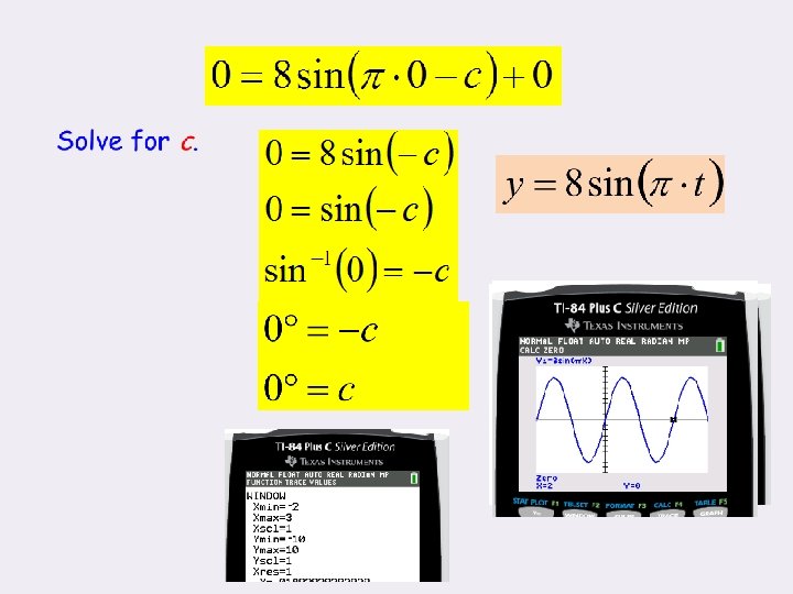 Ex. 2 A weight on a spring bounces a maximum of 8 inches above and below its equilibrium (zero) point. The time for one complete cycle is 2 seconds. Write an equation to describe the motion of this weight, assume the weight is at equilibrium when t = 0. Sine 2 NP = _____ t=0 8 8 To find we must use a given Initial c, point (t, sin(t)) and solve. Use (0, 0). WHY?