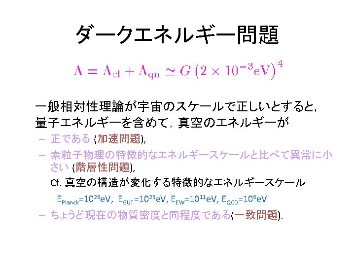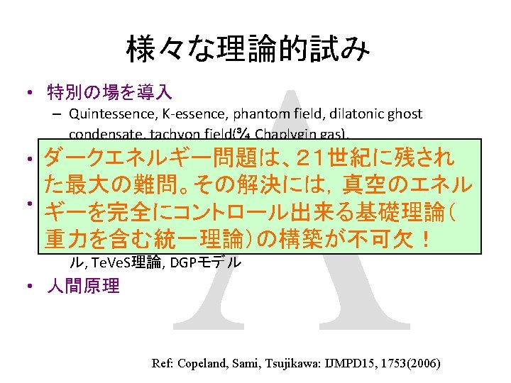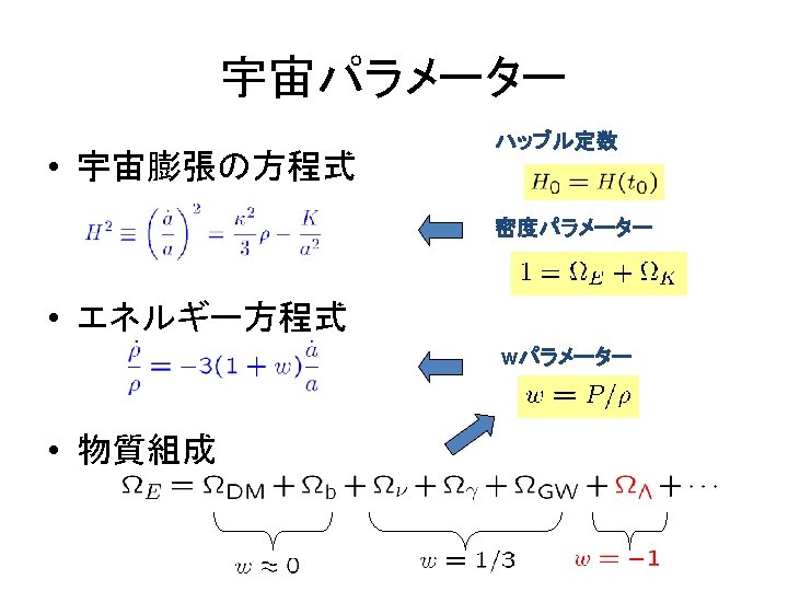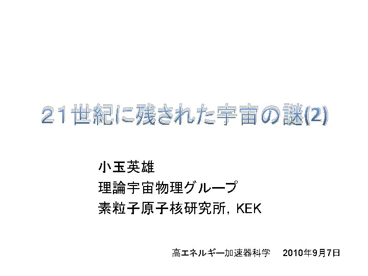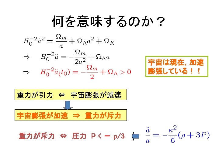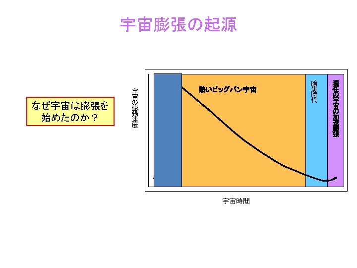 Reacceleration of the Universe 1998 Discovery by SNIa (SNCP, Hz. ST) 2003 WMAP 1 st year 2005 イ BAO (SDSS) 熱いビッグバン宇宙 ン フ WMAP 3 rd year 2006 レ 2007 Chandra X observation (fgas シ method) ョ ー 宇 宙 の 膨 張 速 度 ン WMAP 5 year data 2008 宇宙時間 暗 黒 時 代 現 在 の 宇 宙 の 加 速 膨 張
