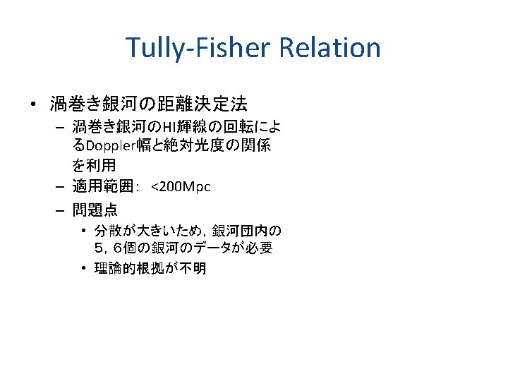 宇宙の距離はしご 方法 適用距離 年周視差測定 0~ 100 pc 星団視差法 100 pc~ 10 kpc 散開星団主系列星 100 pc ~ 50 kpc Cepheid型変光星 Tully-Fisher法 SN Ia 10 kpc~ 25 Mpc 10 Mpc~ 200 Mpc 60 Mpc~ 4000 Mpc