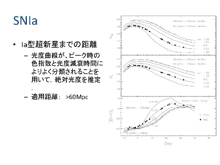 SNIa で宇宙を計測する (High z) Supernova Search Team 1998 Riess AG et al 16 SNe Ia (z=0. 16 -0. 62) + 34 nearbys 2004 Riess AG et al 16 SNe Ia (z>1. 25 by HST) + 170 SNe Supernova Cosmology Project 1997 Perlmutter S et al 7 SNe Ia (z=0. 35 -0. 46) 1998 Perlmutter S et al 42 SNe Ia (z=0. 18 -0. 83) 2003 Knop RA et al 11 SNe Ia (z=0. 36 -0. 86, HST) Supernova Legacy Survey 1 st yr 2005 Astier P 71 SNe Ia (0. 249<z<1. 01) + 44 nearbys Union Compilation 250 at high z + 57 at low z [Kowalski et al (2008)] Union Plus Compilation 492 SNe: Union + Cf. A 3 [Hicken M et al (2009)] SDSS SN Survey [Kessler et al (2009)] Union 2 Compilation 557 Sne [Amanullha R et al (2010)]
