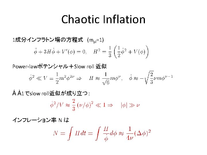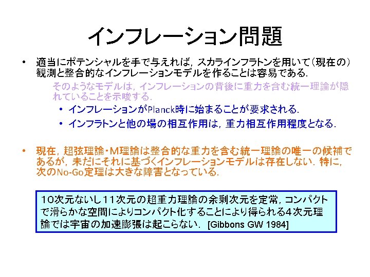 様々なモデル • Old inflation model [Sato K 1981; Guth A 1981] • New inflation model [Linde A 1982; Albrecht A, Steinhardt P 1982] • Chaotic inflation model [Linde A 1983] このモデルでは – 現在のホライズン領域が 1/H となる時期: f. H » 15 [Linde A 1990 B] – ゆらぎの大きさ: H » mf 2/(5¼ 61/2) – COBE規格化: H » 2£ 10 -5 ) m» 3£ 10 -6(=7£ 1012 Ge. V). • Power law inflation model [Abbott LF, Wise MB 1984; Lucchin F, Matarrese S 1985] • Hybrid inflation model [Linde A 1994] – • このモデルでは,f ¸ f. C =M/g のとき s ¼ 0 となり,mが小さいとき f 方向にポテンシャルは平坦となる. m 2 f. C 2= m 2 M 2 /g 2 ¿ M 4 / のとき,臨界点でのHubbleは H 2=M 4/(12 ) となる.したがって,M 2> 2 m 2 /g 2 か つ m 2 ¿ H 2 ならば f >f. C でインフレーションが起きる. DBI inflation model [Alishahiha M, Silverstein E, Tong D 2004]