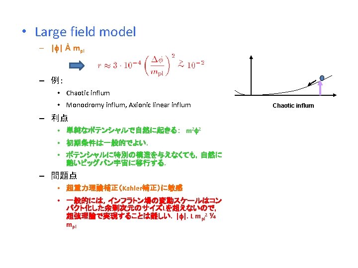 Small Field vs Large Field • Small field model – | | < mpl – 例: • New influm, Hybrid influm, • Racetrack model • D 3 -D 7 brane influm – 問題点 • ポテンシャルを超平坦に微調整 • 量子補正に敏感 • 初期条件の微調整が必要. new influm