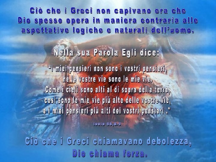 E’ interessante notare che Paolo scrisse quelle parole ai Greci, che esaltavano l’intelletto, la prestanza fisica e il coraggio, l’uomo e le sue imprese, e non tenevano in considerazione i deboli. Tuttavia sappiamo che Paolo aveva una menomazione fisica, la sua “spina nella carne”, come la chiamava (2 Corinzi 12, 7), e i Greci dicevano di lui, ”la sua presenza fisica è debole e la sua parola è cosa da nulla" (2 Corinzi 10, 10). Nemmeno il fatto che fosse stato schernito, lapidato, frustato e imprigionato migliorava molto la sua reputazione. In poche parole, Paolo non incarnava esattamente la concezione greca di forza.