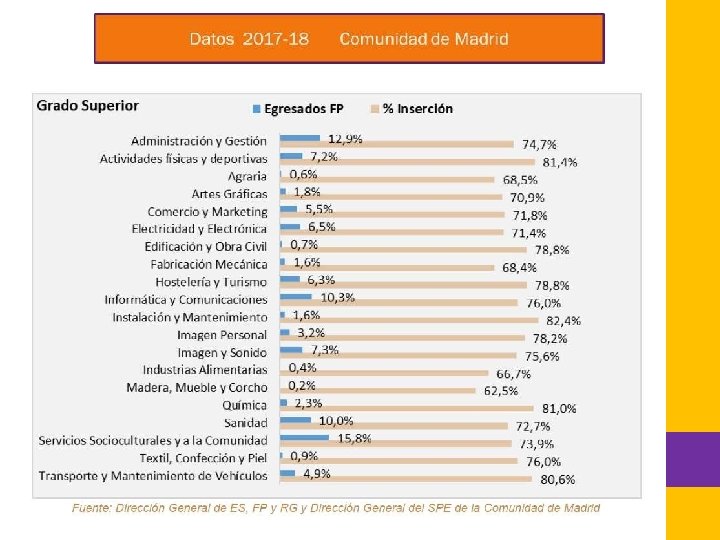 ¿Qué oferta hay? 78 Títulos de Grado Superior OFERTA Actividades Físicas y deportivas Imagen Personal Administración y Gestión Agraria Artes Gráficas Comercio y Márketing Imagen y sonido Industrias alimentarias Informática y Comunicaciones Instalación y mantenimiento Edificación y Obra Civil Química Electricidad Electrónica Sanidad Energía y Agua Servicios Socioculturales Y a la Comunidad Fabricación Mecánica Textil, confección y piel Hostelería y Turismo Transporte y mantenimiento de vehículos Maderas, Muebles y Corcho