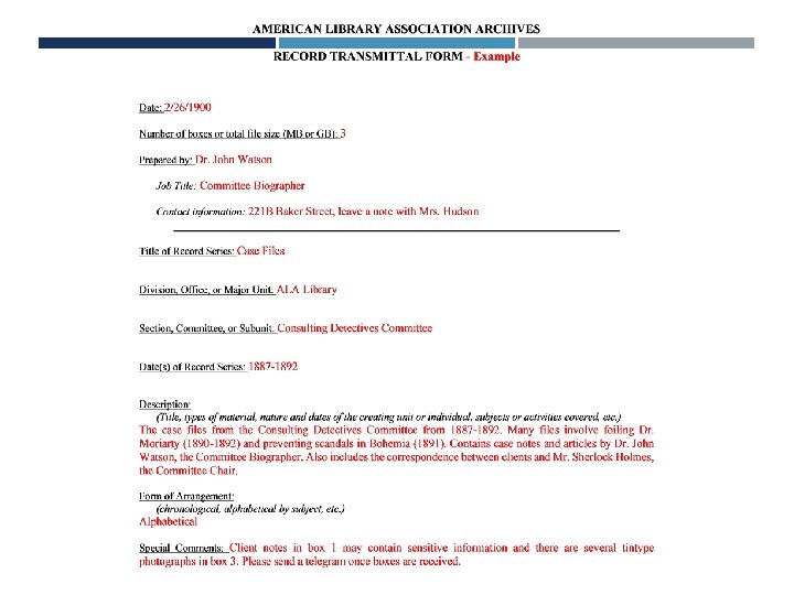 THE TRANSMITTAL Be Sure to Fill Out a Transmittal! Transmittal form can be found here: http: //archives. library. illinois. edu/ala/files/2014/05/ALA-Archives-transmittalform. pdf Be as descriptive as possible when filling out the form! What topics/projects are covered by these files? What is the date range? Who created these files? You do not need a box and file list, but if you have on hand the Archives would love to have it. Make note of any special concerns, such as restrictions and fragile materials. Leave the contact information for a supervising staff member if an intern or volunteer fills out the transmittal. It is a good idea to put a copy of the transmittal in each box so the Archives staff knows where it came from. This does not mean you have to create a new transmittal for each box. Create one transmittal for the entire grouping of records and make as many copies as you have boxes. Keep a copy for your records so you know what you sent and when you sent it.