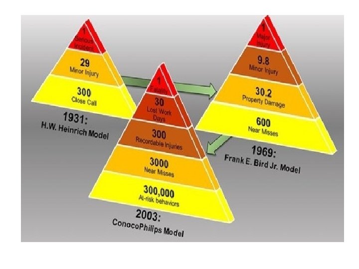 Accident Pyramid • Heinrich introduced the accident pyramid in his book, Industrial Accident Prevention: A Scientific Approach. • This pyramid illustrated his accident causation theory. • Heinrich believed that unsafe acts led first to minor injuries and then over a period of time to a major injury event. • The accident pyramid proposed that 300 unsafe acts produced 29 minor injuries and 1 major injury. • The concept of the accident pyramid remained unchallenged many years. However, some recent studies challenge the assumed shape of the equilateral triangle used by Heinrich. Some professionals now believe the actual shape of the model would depend on organizational structure and culture.