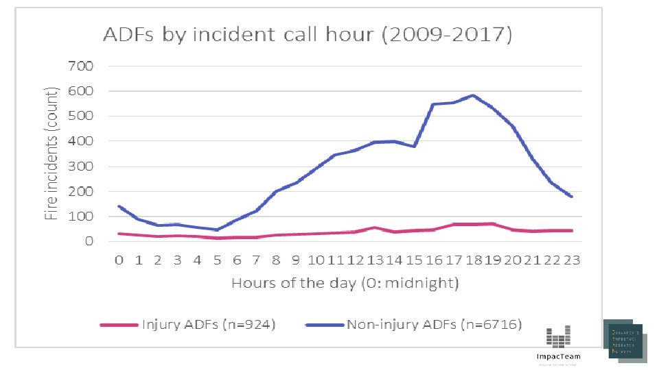 Injury ADFs by incident call hour (2009 -2017) 80 70 Fire incidents (count) 60 50 40 30 20 10 0 0 1 2 3 4 5 6 7 8 9 10 11 12 13 14 Hours of the day (0: midnight) Injury ADFs (n=924) 15 16 17 18 19 20 21 22 23