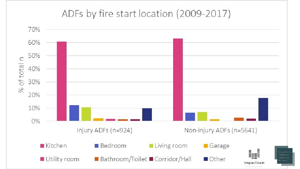 Kitchen ADFs - fire source (2009 -2017) 100% 90% 80% 70% % of total n 60% 50% 40% 30% 20% 10% 0% Cooking appliance Electric lighting/supply Fuel/Chemical Injury ADFs (n=554) Heating/flame Non-injury ADFs (n=3547) Other Domestic appliance