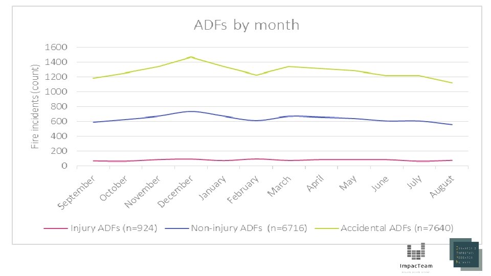 Injury ADFs by month 100 90 80 Fire incidents (count) 70 60 50 40 30 20 10 0 September October November December January February March Injury ADFs (n=924) April May June July August