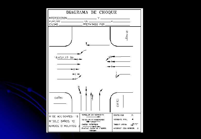 Los diagramas de choque l pueden prepararse para todo tipo de lugar, sin embargo, son más utilizados para intersecciones. Los elementos más importantes en un diagrama de choque, bajo el punto de vista de la ingeniería de tránsito, son: l Qué hacía el conductor antes del accidente giro a la izquierda, reducir la velocidad, o parar para estacionarse, etc. l La trayectoria del vehículo. l Cualquier situación poco usual sobre el tiempo o superficie de la calle. l Fecha, día y hora.