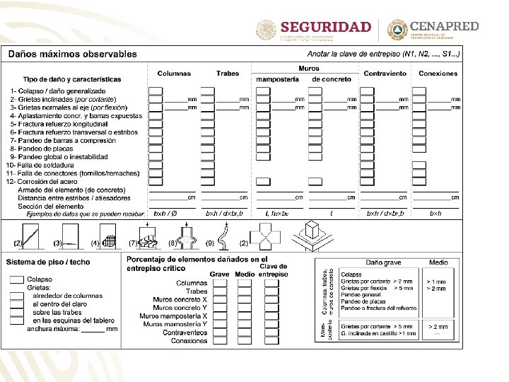 Vulnerabilidad de vivienda No. Vulnerabilida viviendas d Tipología de vivienda en Colima Muros de mampostería con techos rígidos 147, 772 Baja 49, 595 Media Muros de mampostería con techos flexibles Muros de adobe con techos rígidos 1, 536 Muros de adobe con techos flexibles Muros de materiales débiles con techos flexibles 515 1, 390 Alta Vivienda no clasificada 4, 141 Muy Alta 28% Fuente: Encuenta intercensal INEGI 2015 La edificación para vivienda, promedio estatal, presenta un nivel medio (nivel 4, en una escala de 1, muy bajo, y 7, muy alto) de susceptibilidad de daño por sismo. Para el caso de vientos fuertes, promedio estatal, presenta un nivel medio (nivel 4, en una escala de 1, muy bajo, y 7, muy alto) de susceptibilidad de daño por viento. Actividades con las que CENAPRED puede contribuir al fortalecimiento de capacidades para la evaluación de la seguridad de las construcciones e infraestructura. Uso de un formato y un manual para valorar cuantitativamente la vulnerabilidad estructural, previo a la ocurrencia de un fenómeno , principalmente sismo. Curso de formación de instructores para que la