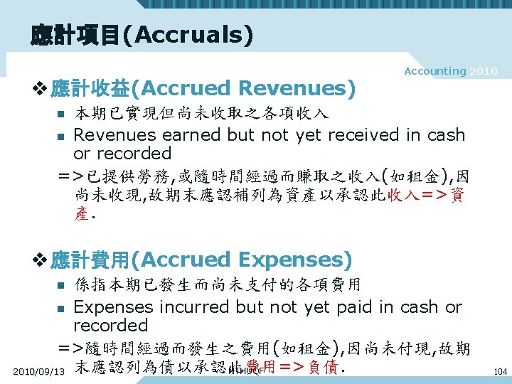 應計項目(Accruals) Accounting 2010 v Adjusting entries n Required to record revenues earned and expenses incurred in the current period v Adjusting entry for accruals n 2010/09/13 Influence both a balance sheet and an income statement account NTHUQF 105