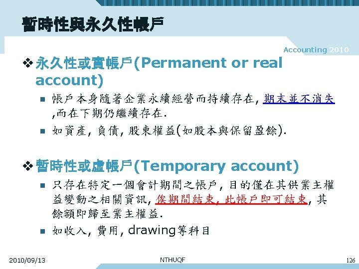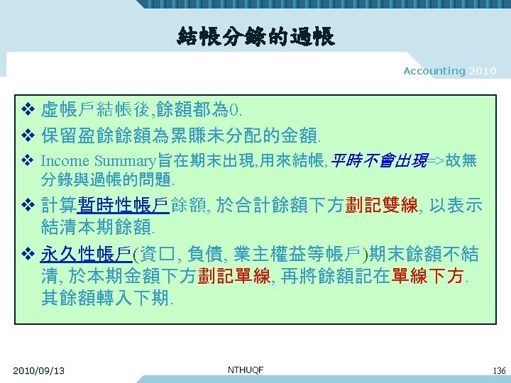 結帳: Temporary & Permanent Accounts Accounting 2010 (NOMINAL) 2010/09/13 (REAL) NTHUQF 125